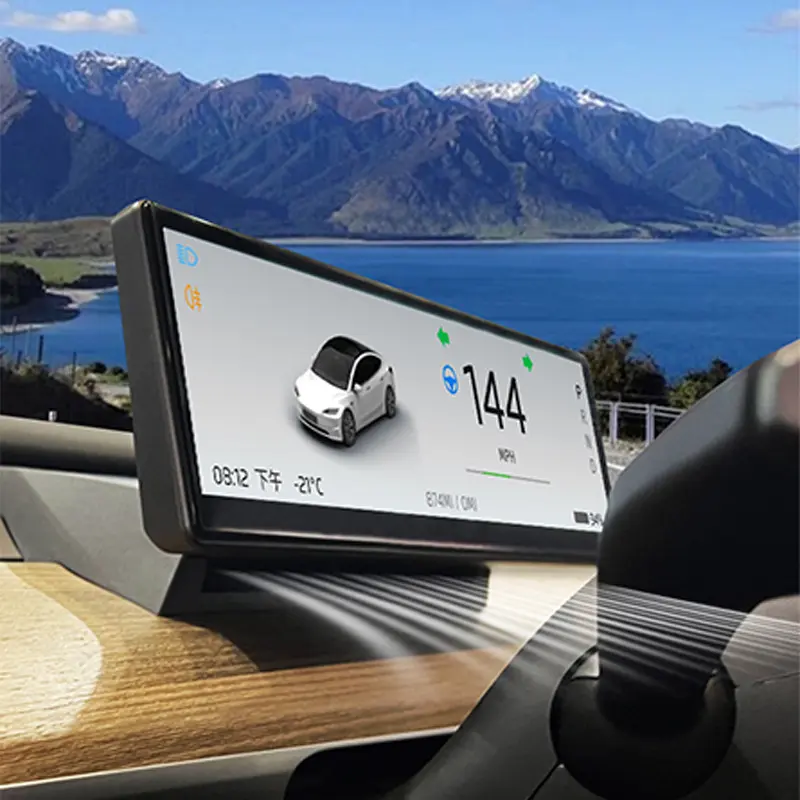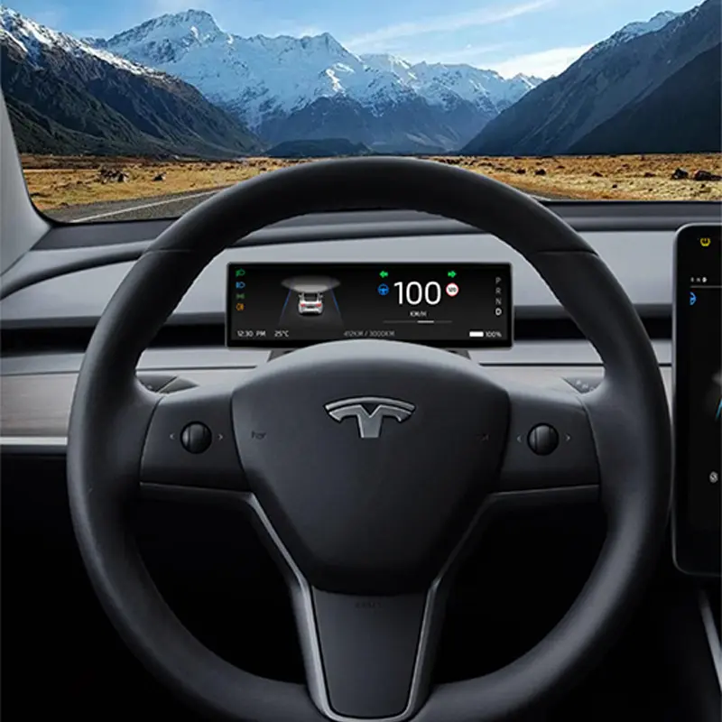 Shows vehicle data: turn signals, gear, speed, remaining battery, etc.