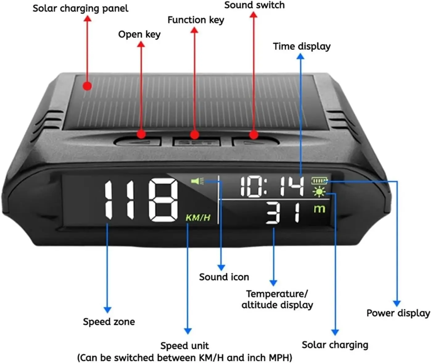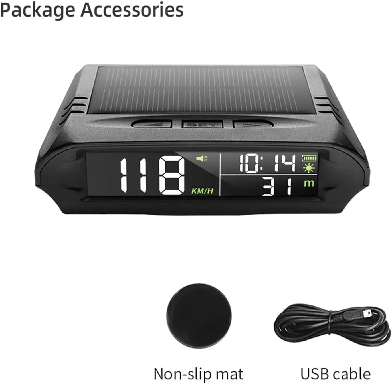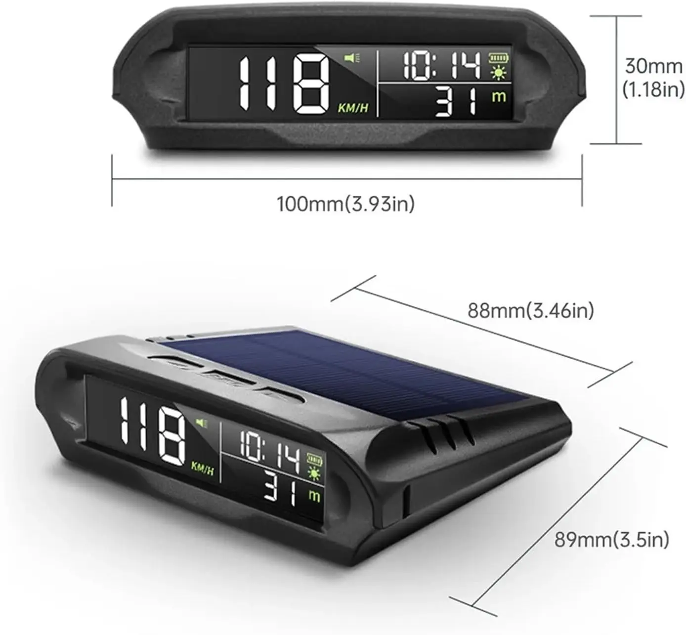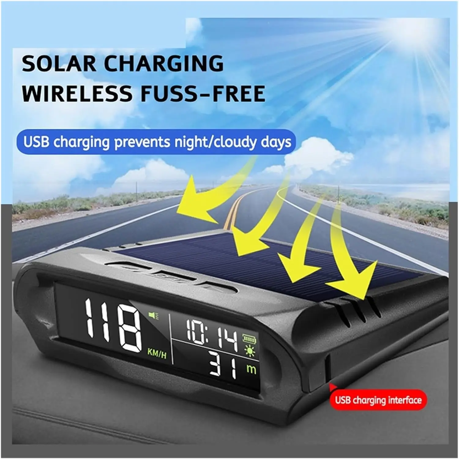 Solar-powered 12–30V GPS HUD-style display for cars and trucks. Shows speed, GPS time, altitude and compass, plus roll/pitch angle with adjustable overspeed and fatigue-driving alerts. Solar charging + USB backup. Universal dashboard mount.
